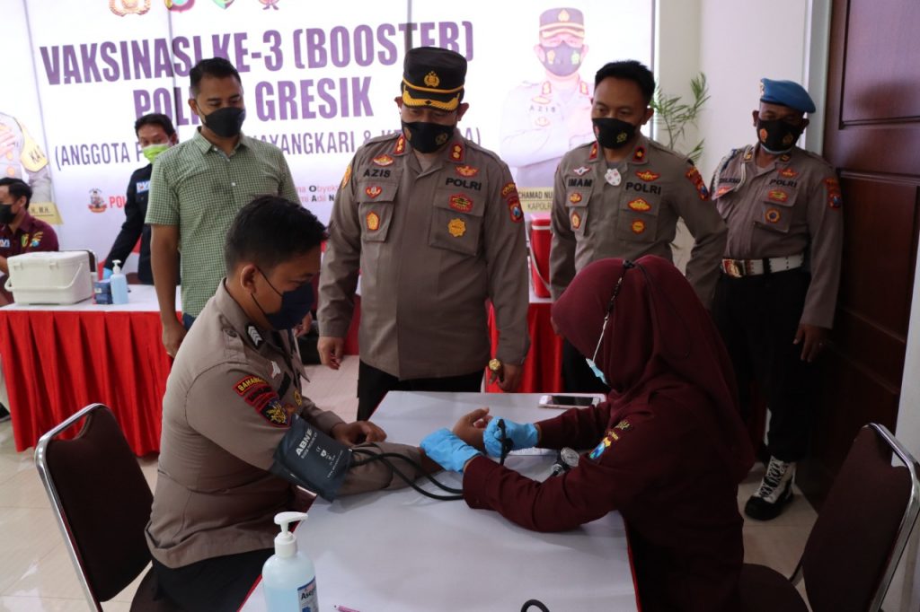 “Vaksinasi booster kita laksanakan seluruh anggota Polres Gresik. Tujuannya menjaga imunitas,”kata Kapolres Gresik.